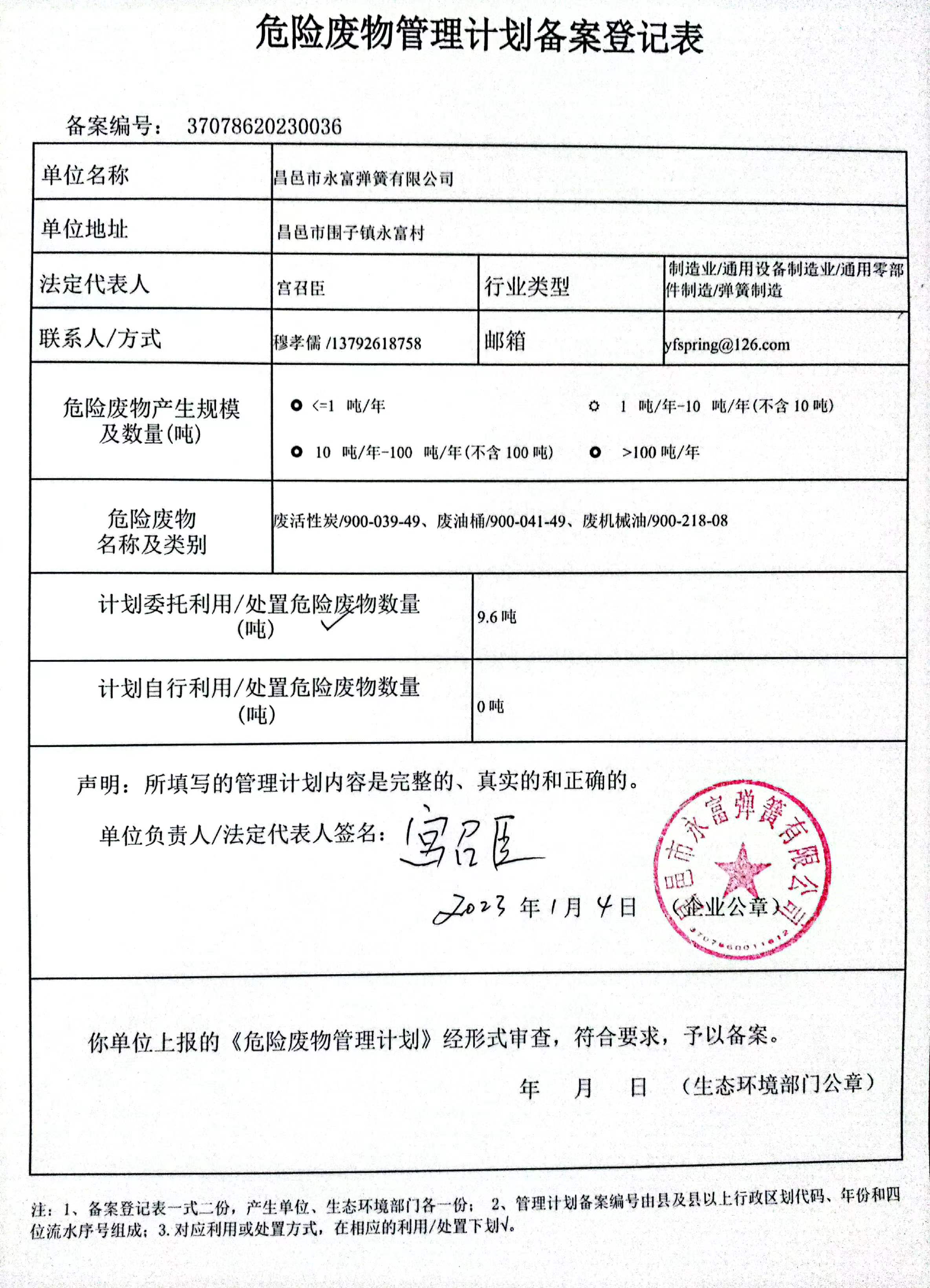 永富彈簧危險廢物管理計(jì)劃備案登記表